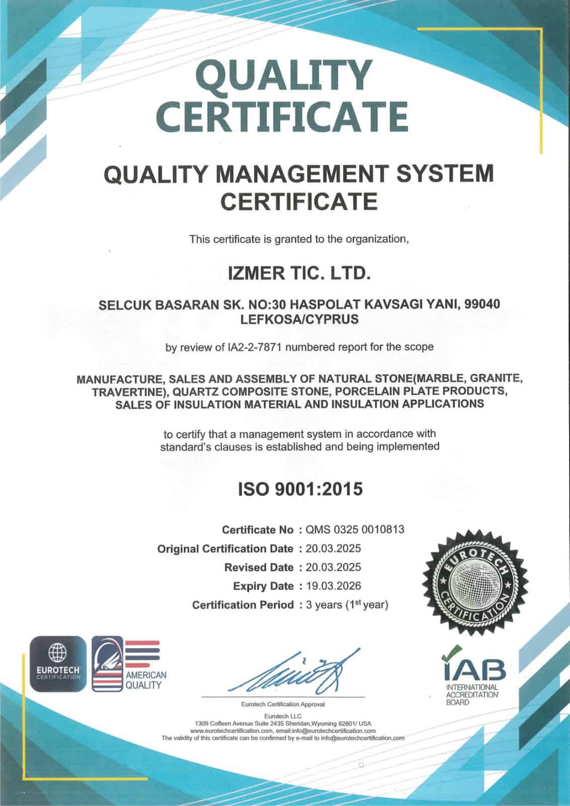 As Izmer Ticaret Ltd., we are committed to complying the conditions of the Quality Management System that we have created according to the requirements of ISO 9001 Quality Management System and will continuously improve its effectiveness.